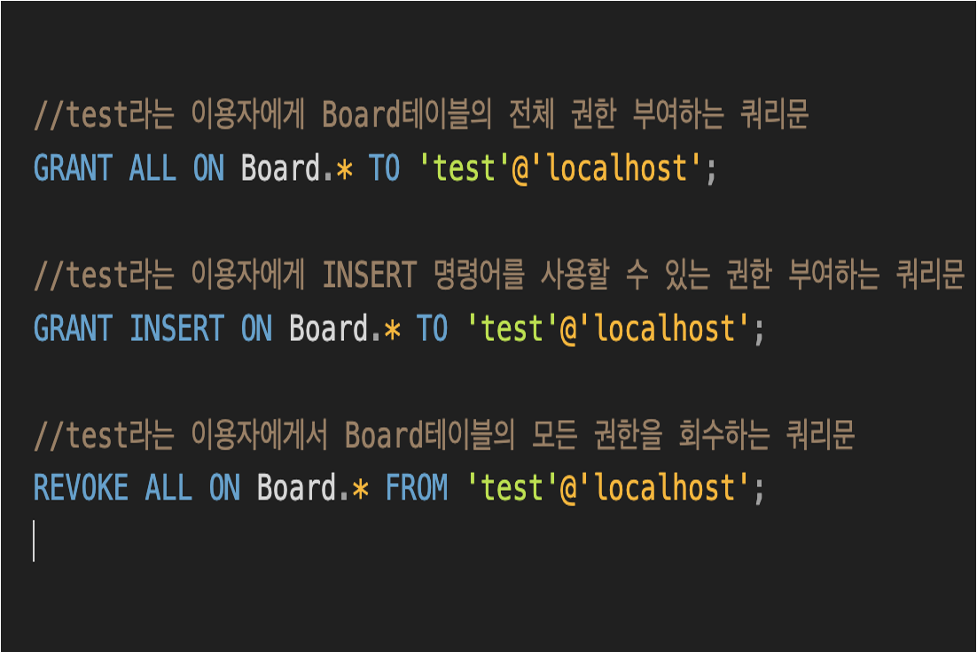 - GRANT : 특정 사용자에게 권한 부여